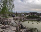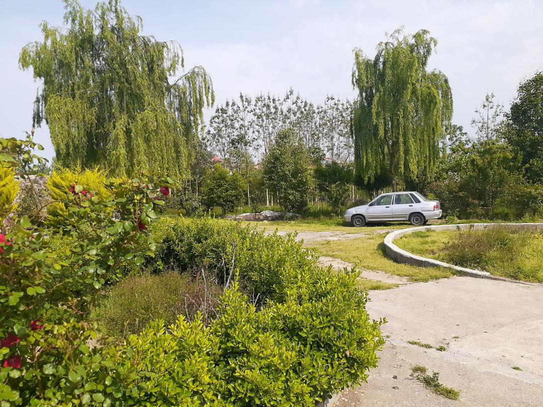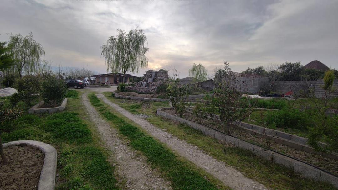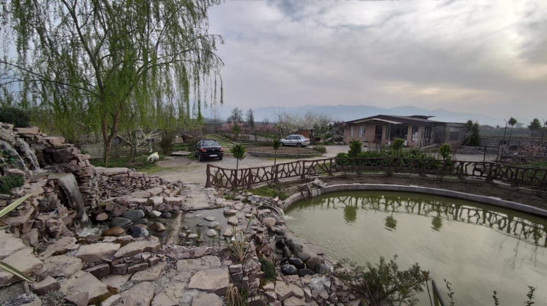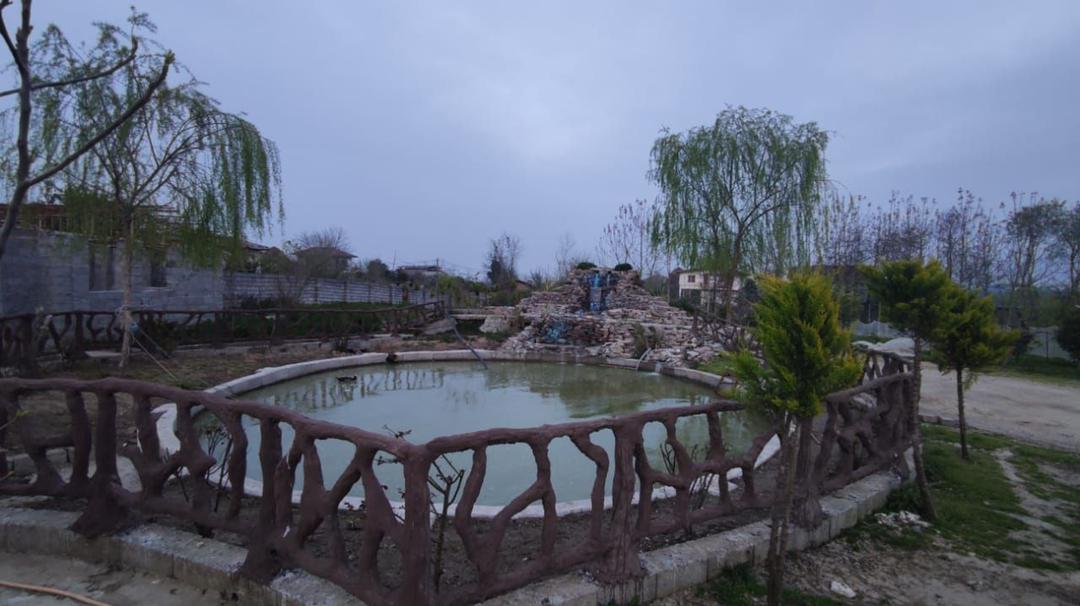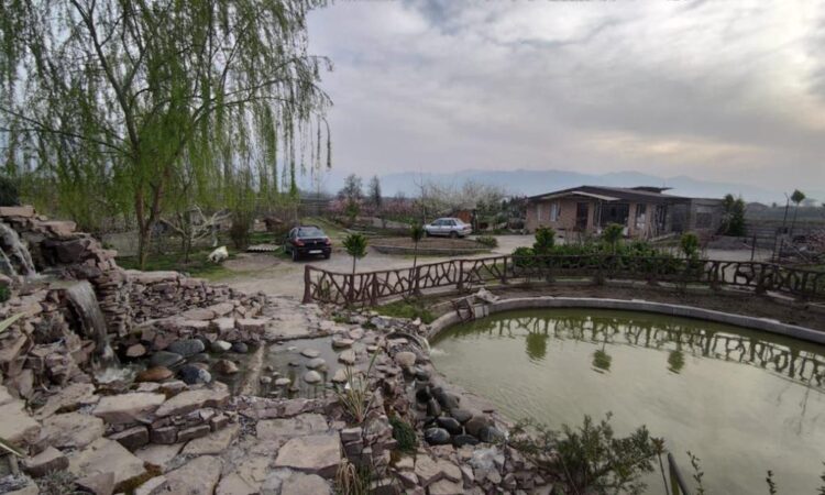 محوطهسازی شده با درختان ارزشمند پالونیا و آبشار و نماسازی آلاچیق سنتی همراه با سیستم آبیاری قطره ای